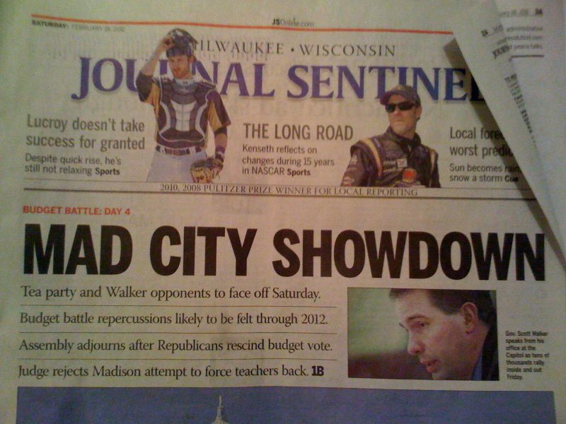 Milwaukee, Wisconsin, where I currently reside, has four major news stations and one major newspaper, The Milwaukee Journal Sentinel. These local news sources, like every local news source across Wisconsin and now America, have been reporting on all of the latest developments of the budget protests in Madison, Wisconsin and providing up-to-the-minute information whenever possible. The protests started seven days ago and when they did, they were given some interesting labels by the local news.  The protests in Madison were referred to as “Mayhem in Madison,” “Madtown Frenzy” and “The Mad City Showdown.