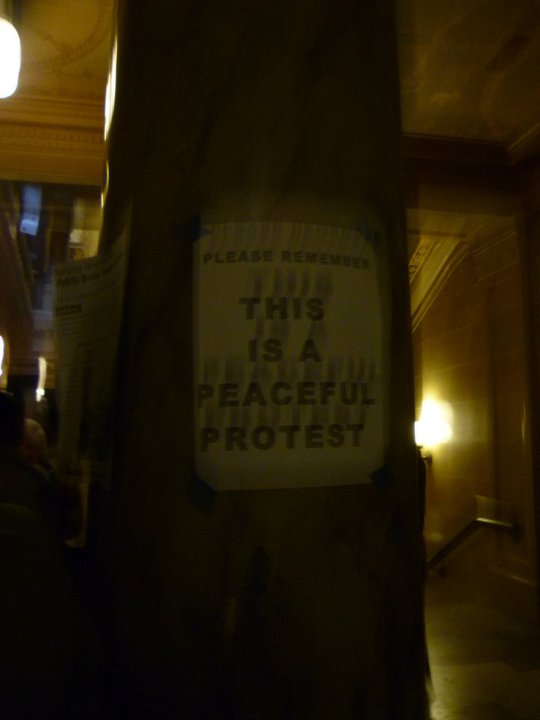 Secondly, the protests and rallies in and of themselves were peaceful. That was the whole point. There were even signs posted inside the Capitol reminding folks that “this is a peaceful protest.” The point of the rallies was for union members and supporters to have their voices heard and to stand together in solidarity. The people I encountered were warm, respectful, and passionate. Having the opportunity to voice my opinion inside the halls of our state’s Capitol along with thousands of other people who felt the same way was pretty powerful to say the least.