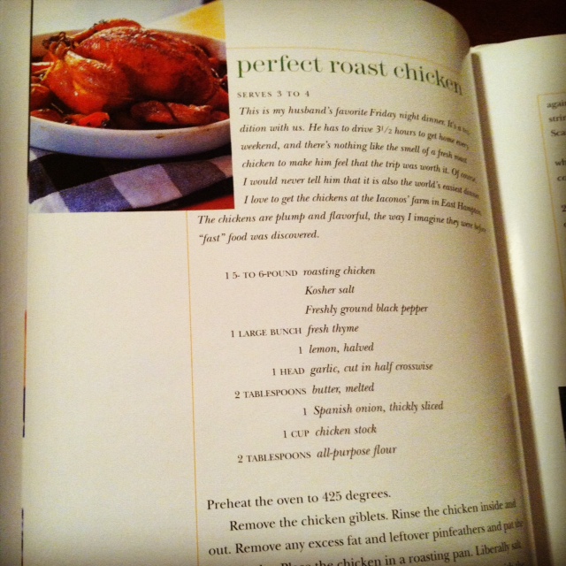 Intrigued, I ran to my kitchen and picked up my copy of The Barefoot Contessa Cookbook. Sure enough, there was the recipe for roasted chicken that she had just made. The Spanish onions, the lemon, the garlic, the recipe for the gravy that looked seemingly effortless–engagement chicken at my fingertips.
